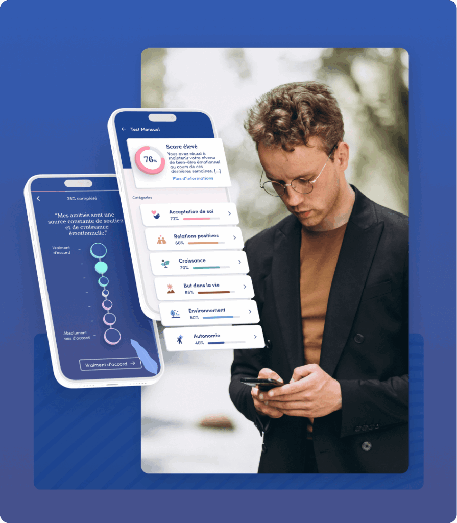 Nos outils permettent aux salariés de surveiller leur état émotionnel quotidiennement et mensuellement, de faire des exercices personnalisés et d'explorer des lectures cliniques.